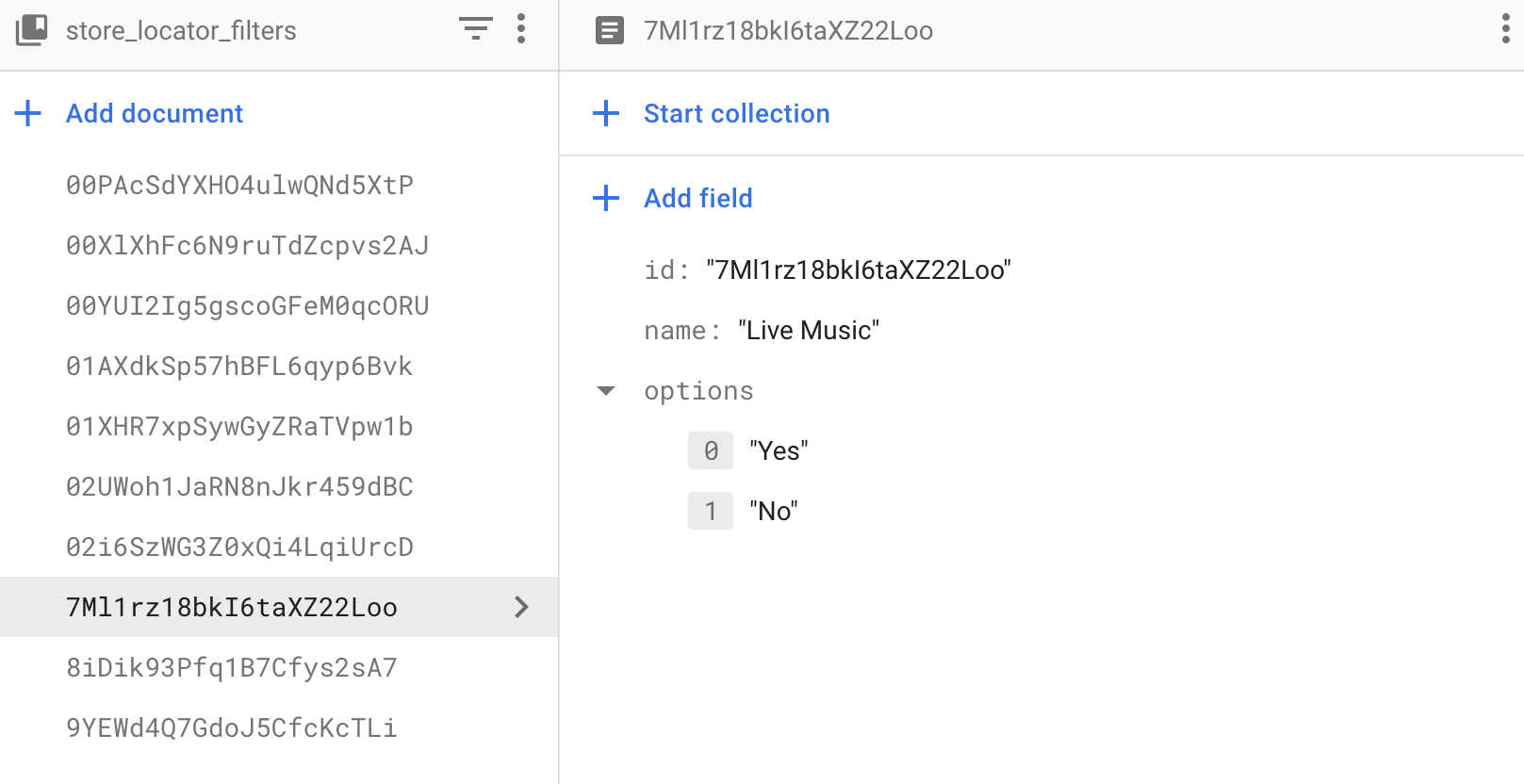 id: String // same value as the document id name: String options: ArrayList<String>